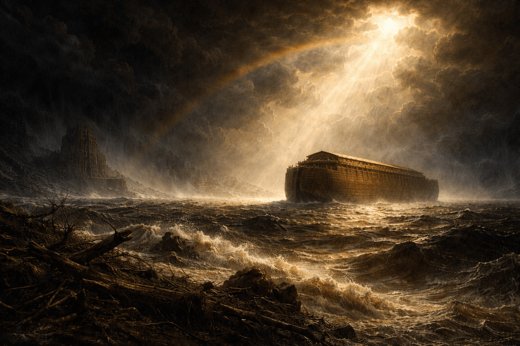 This is the insight carried in the image of the rainbow placed in the sky before the waters have fully receded, before the survivors have demonstrated anything, before the next departure has been forestalled. The covenant is not a reward for the ark’s seaworthiness. It is the ground within which the whole subsequent story unfolds — the assurance, given before every future failure, that the correction will not be final. That the New Ground will come. That the direction toward which proper orientation points is the direction toward what has already, from outside the cycle’s own resources, prevailed.